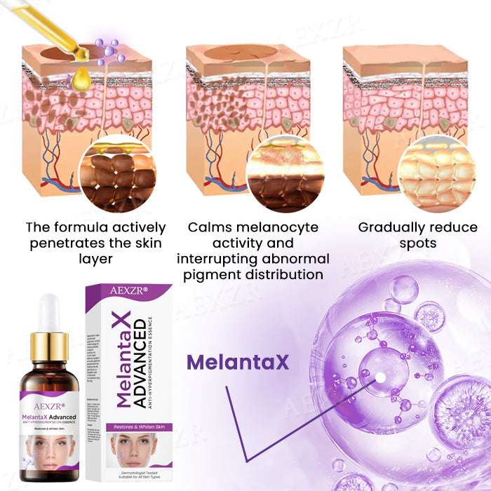 Unlike ordinary brightening serums that work only on the surface, MelantaX goes deeper. Its advanced formula penetrates the skin to regulate melanin at its root, calming the overactive pigment cells responsible for spots and discoloration. A unique delivery system ensures these active ingredients reach multiple layers of the skin, creating lasting improvement rather than temporary lightening.